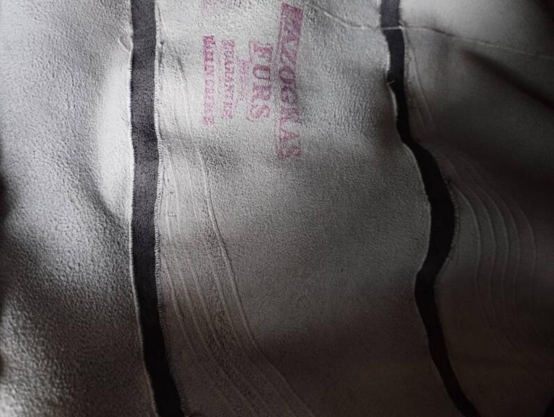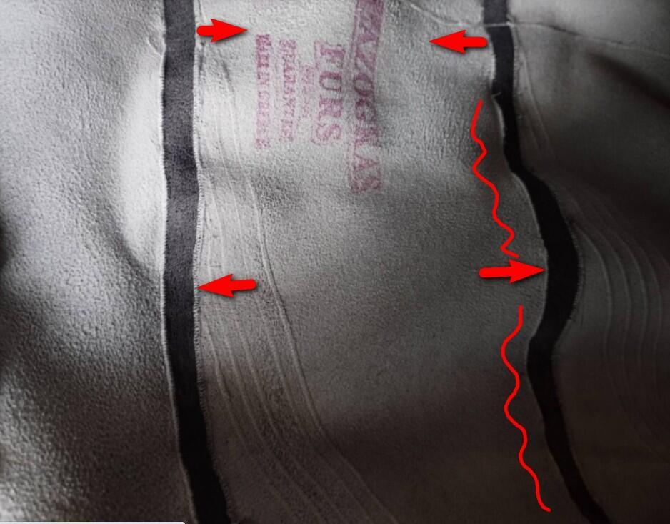 Спецификой греческой технологии т.н. "двойной правки" ( когда шкурки оправляются по-максимуму, затем подроспуском ширину шкурки переводят в длину, затем детали пальто собираются и оправляются еще раз, по лекалу) является очень сильное намокание полуфабриката в процессе производства. Мокрые шкурки имеют очень большую пластичность и поддаются перетяжке, но после высыхания сильно затвердевают до фанерного состояния. Такое затвердевание на заре меховых производств снимали механическим способом, откатывая скрои в специальном барабане (типа пустой стиральной машины) на сухую. Позднее обнаружили, что стандартная химчистка имеет тот же эффект на химическом уровне, причем ( в отличие от барабана) способна ликвидировать очень сильное затвердевание. Поэтому в технологии двойной правки происходит синергия двух довольно проблемных процессов: при перетяжке шкурка получает излишние напряжения, ее геометрия нестабильна; сильное затвердевание требует очень жестких режимов химчистки для размягчения, после которых результаты правки остаются лишь в рамках общих контуров, области с перетяжкой садятся, области с остаточным люфтом и тонкой мездрой - растягиваются. Это все хорошо видно на фото с изнанки. Шкурки для расшивки - крашеные, краска сильно подсаживает шкурку, уплотняет мездру и снижает пластичность, такие шкурки невозможно растянуть, соответственно, они очень стабильны по геометрии. Соответственны, они в рамках изделия являются каркасом идеальных длин (ширина их слишком мала для оказывания сильного влияния).