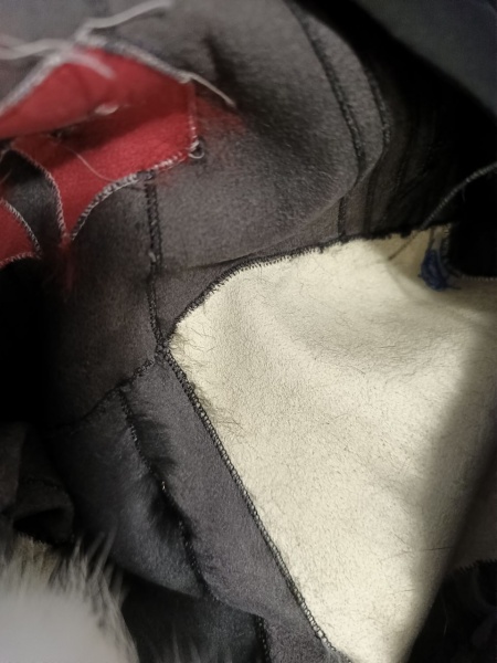 Желтого оттенка нет совсем, это недостаток камеры телефона. Еще какая то уж через чур блестящая. И вот мездра на фото. Ничем дополнительно ни прошита ни проклеена. Высота меха при инкрустации не подогнана
