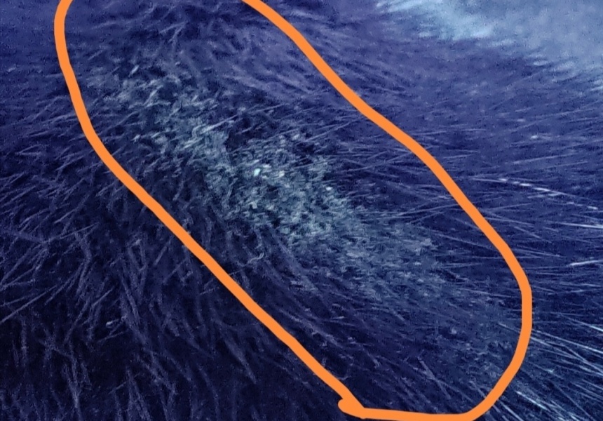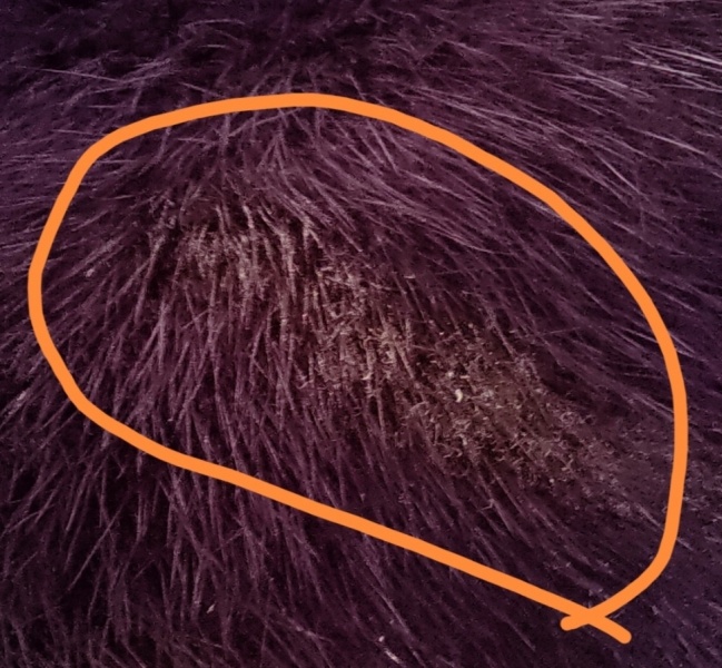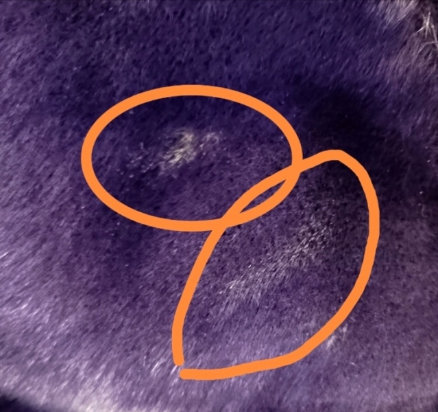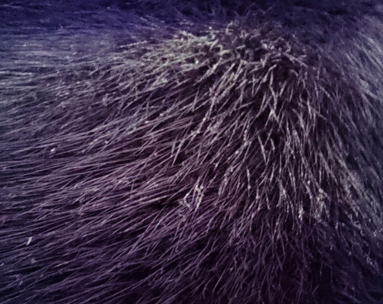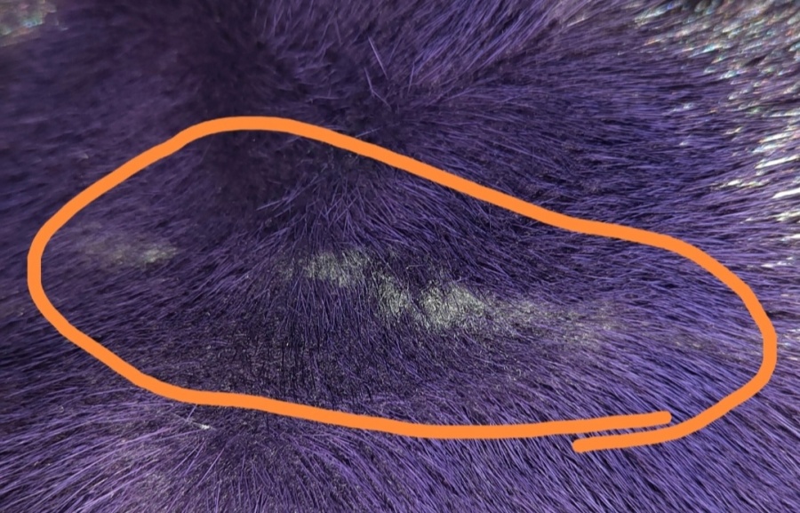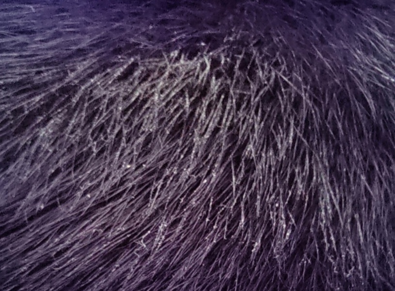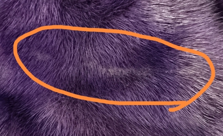 Уважаемые эксперты, подскажите, отчего могут быть вот такие полосы и пятна на мехе. Снимаются и отряхиваются легко, на ощупь на пальцах остаются как мелкие крупинки. Не уверена, показалось или нет, но верхушки остевых волосков как будто короче в этом месте