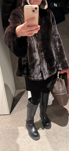 • Девочки всех кто нашел свои шубки поздравляю, рада, что своими походами и обзорами помогла . Долгим своим мучительным выбором поняла, что с учетом , что зимы осталось шиш и маленько... Поняла , что одной шубы мне все ж мало , решила , то уже не за горами ( в апреле ) пройдут новые выставки и захочется чего-то нового решила , что длинной быть в следующем сезоне . Поэтому первой покупкой, исходя из приобретения новых сапог и сумки , решила добавить им до полного образа короткую шубку . Очень хорошо села и с джинсами и широкими брюками тоже . Причем цвет , конечно так не передать , но он прям темный - темный шоколад и шубка приехала вместе с длинной , которую ждала , но короткая села интереснее . Очень красиво смотрятся такие объёмные книзу рукава , ( внутри есть кулиска . И на короткой шубке объём смотрится красиво , а я люблю , что б он в мехе был хоть где-нибудь. Про длинные два мнения продавцов , оно , что будет шалька , но такая минимальная и второе , что английский воротник , но маленький прям рубашечный . Та, что жду новые модели .
