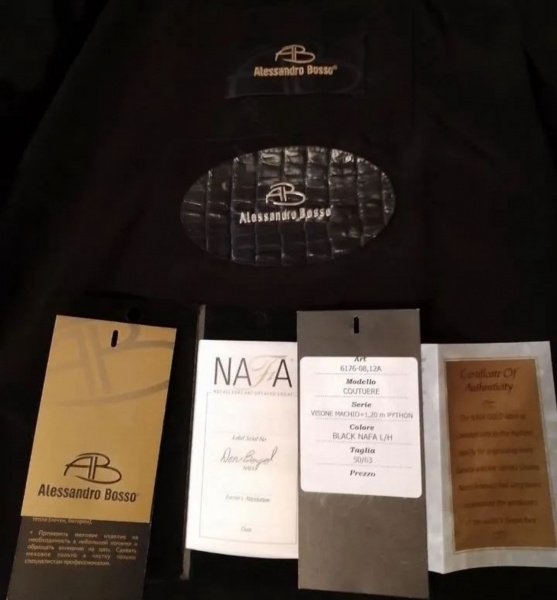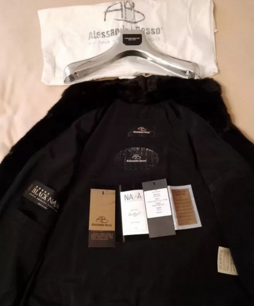Теперь про саму шубу: это непонятно что и мех, похоже, не нафа, ярлыки от другой шубы (ярлык нафа очень старый). Посмотрите шубы алессандро боссо: у них в зоне шеи один ярлык на коже/кожзаме с теснением крокодила. Подклад нефирменный. А еще на одной из бирок написано, что это модель «кутюр», ее длина 120 см и она имеет вставки из питона. Опять же, если загуглить на авито шубы алессандро боссо, там действительно видно, что у одних карманы отделаны питоном, у других вставки из питона на рукавах. Никаких вставок из питона на этой шубе нет и она короткая. Предположение: продавец где-то раздобыла чехол, бирки и ярлыки от другой шубы и приложила к этой. Даже без учета вранья про оригинал, шуба не новая, это видно. В лучшем случае, это перешив из старой алессандро боссо, но это не подпадает под описание «новая, оригинал».